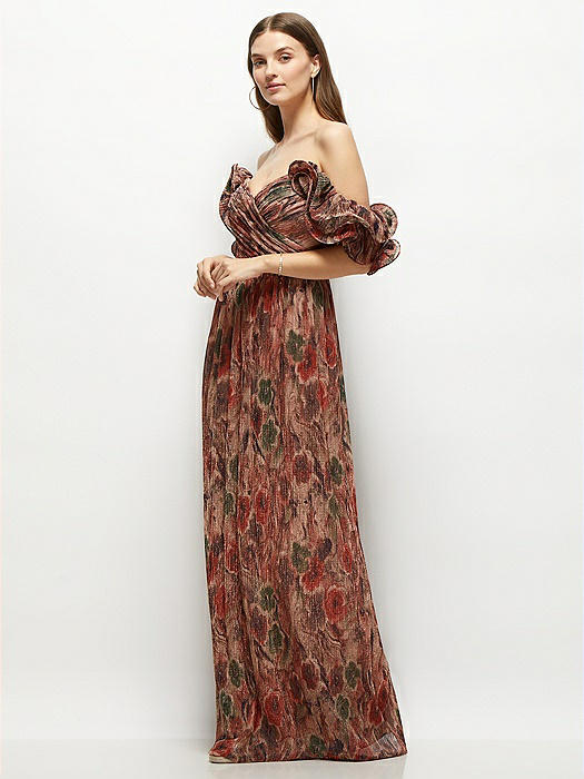 Dramatic Ruffle Edge One-Shoulder Fall Foral Pleated Metallic Maxi Dress in harvest floral print