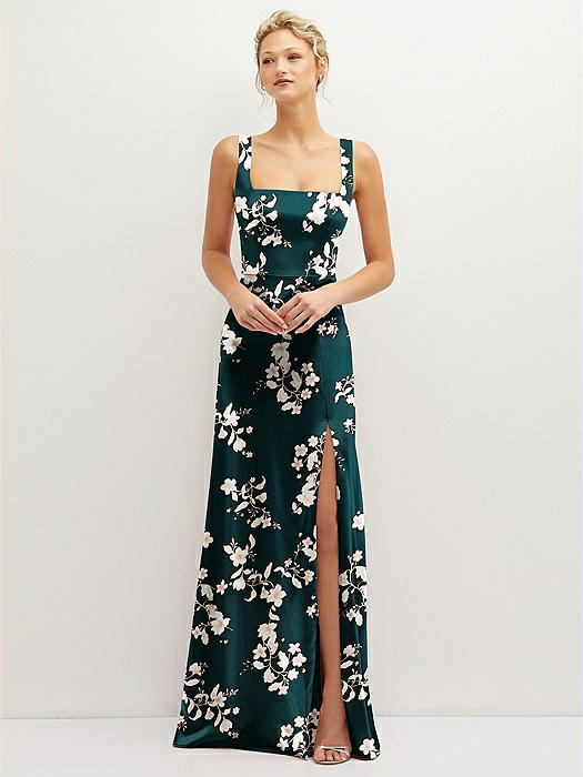 Floral Square-Neck Satin A-line Maxi Dress with Front Slit in vintage primrose evergreen