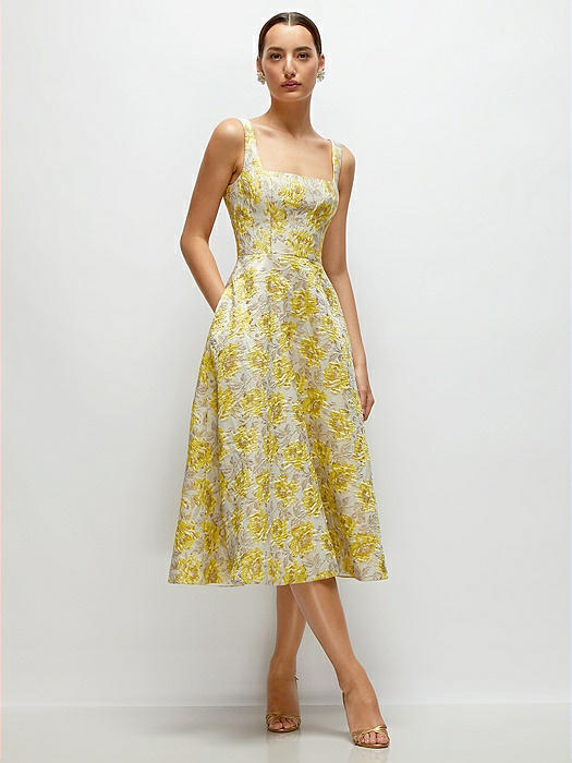 Golden Yellow Square Neck Floral Jacquard Midi Dress in golden yellow