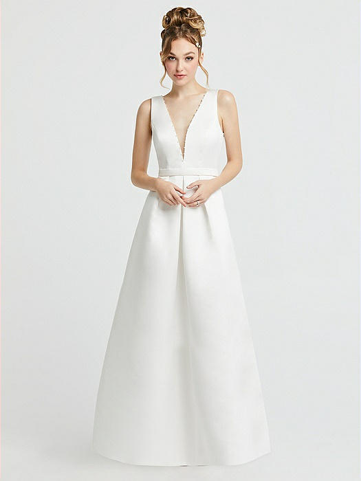 Pearl-Trimmed Deep V-Neck Satin Wedding Dress with Pockets in off white