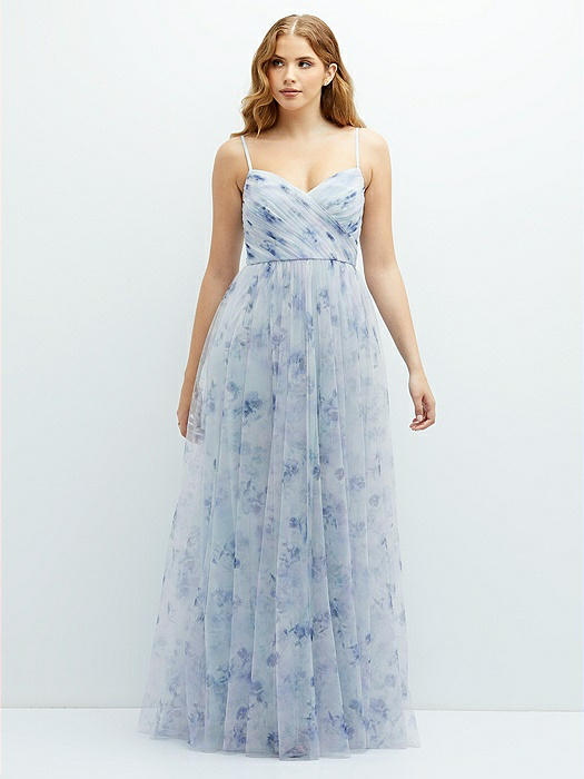 Floral Ruched Wrap Bodice Tulle Dress with Long Full Skirt in mist garden