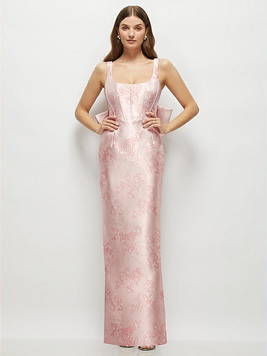 Strapless Floral Satin Column Maxi Dress with Oversized Bow in bow and blossom print