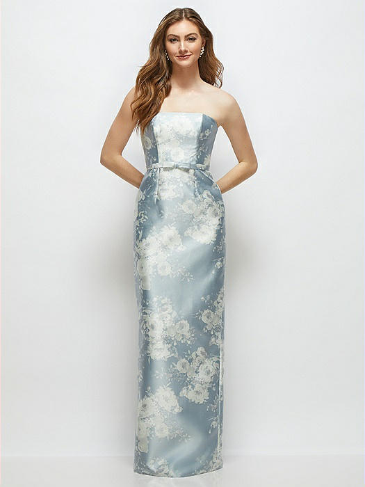 Floral Strapless Satin Column Dress with Bow-Trimmed Skinny Belt in porcelain blue seraphina floral