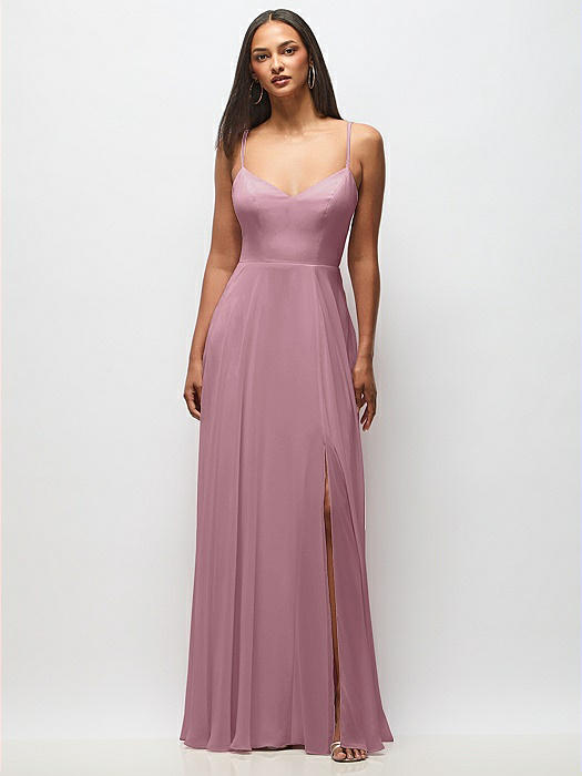 Bow-Shoulder V-Back Chiffon Gown with Front Slit in orchid pink
