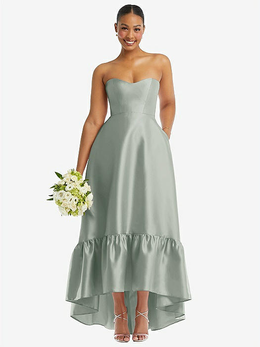 Strapless Deep Ruffle Hem Satin High Low Dress with Pockets in willow green