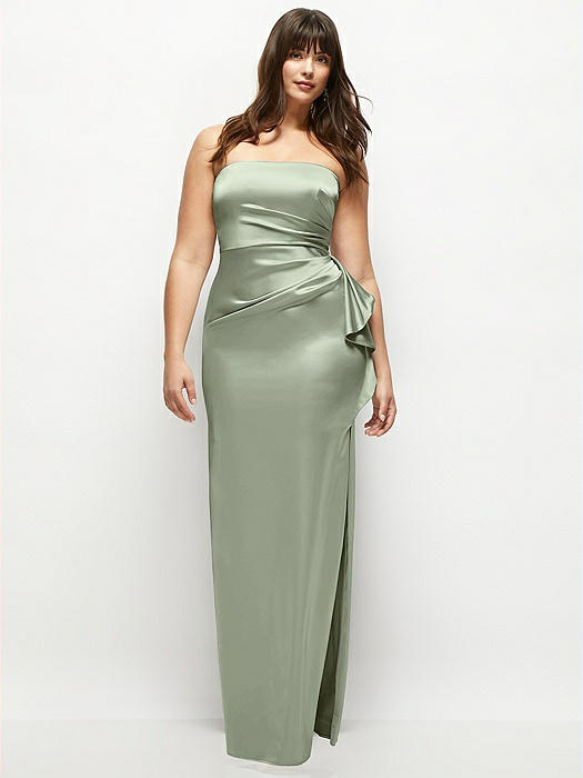 Strapless Draped Skirt Satin Maxi Dress with Cascade Ruffle in sage