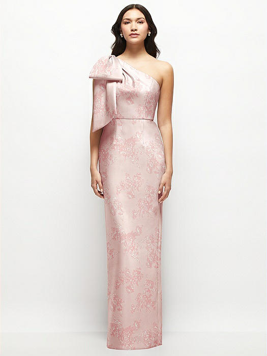 Oversized Bow One-Shoulder Floral Satin Column Maxi Dress in bow and blossom print