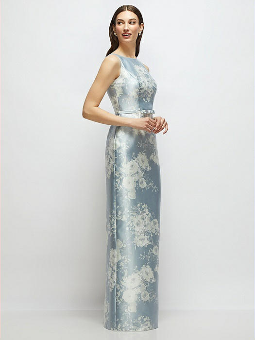 Floral Bateau Neck Satin Column Dress with Bow-Trimmed Skinny Belt in porcelain blue seraphina floral