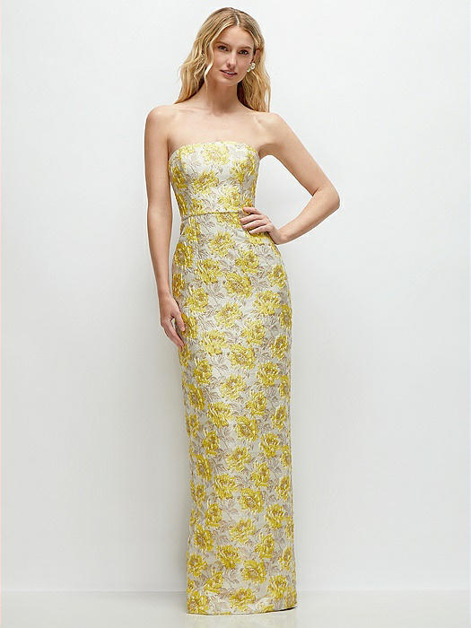 Golden Yellow Strapless Floral Jacquard Column Dress with Back Slit in golden yellow