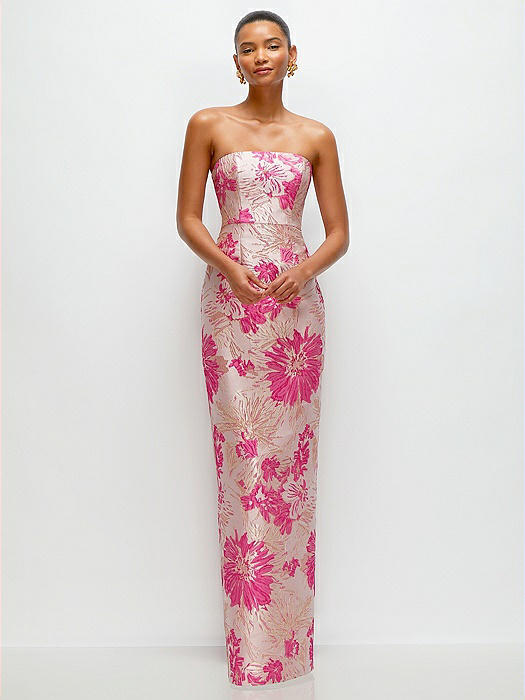 Hibiscus Pink Strapless Floral Jacquard Column Dress with Back Slit in hibiscus pink multi