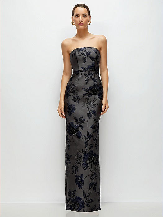 Noir Midnight Navy Strapless Floral Metallic Jacquard Column Dress with Back Slit in noir midnight navy