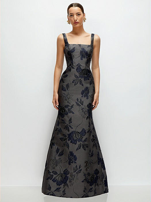 Noir Midnight Navy Floral Metallic Jacquard Square Neck Maxi Dress with Trumpet Skirt in noir midnight navy