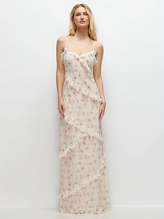 Asymmetrical Ruffle Chiffon Bias Slip Maxi Dress in coquette floral print