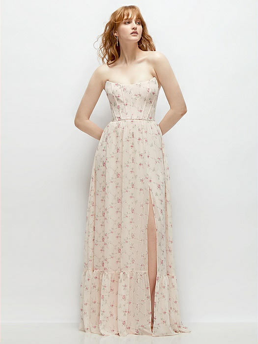 Strapless Cat-Eye Corset Maxi Dress with Ruffle Hem A-Line Skirt in coquette floral print