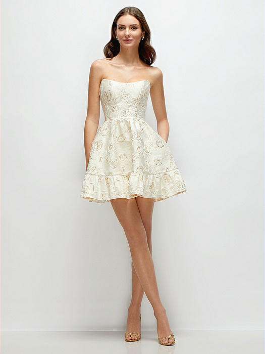 Strapless Cat-Eye Corset Ivory Gold Gilt Rosette Brocade Mini Dress with Ruffle Hem in ivory gold rosette