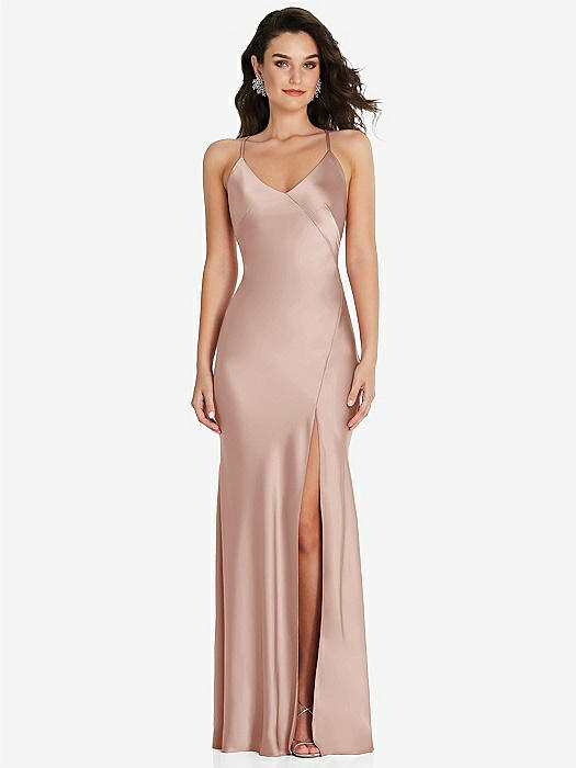 V-Neck Convertible Strap Bias Slip Dress with Front Slit in toasted sugar