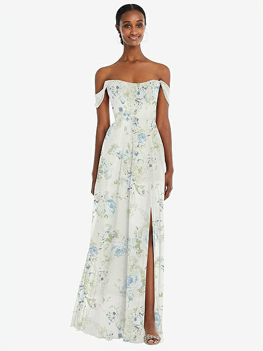 Off-the-Shoulder Basque Neck Maxi Dress with Flounce Sleeves in bleu garden