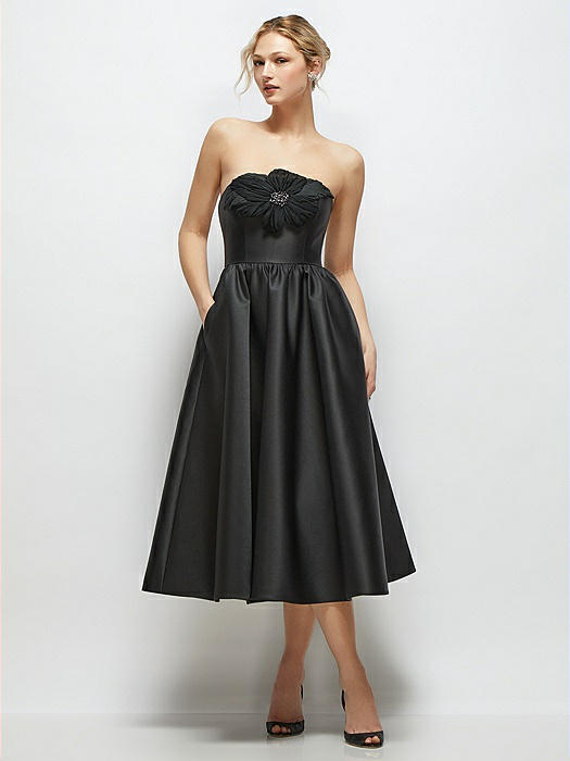Strapless Satin Midi Dress with Handmade Flower & Horsehair Hem in black