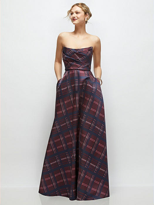 Strapless Draped Tartan Cat-Eye Satin Maxi Dress with Full Skirt in cabernet midnight tartan
