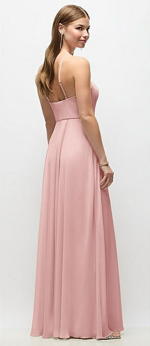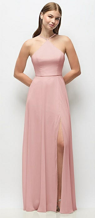 High-Neck Halter Chiffon Maxi Dress with Adjustable Spaghetti Straps in rose