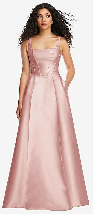 Boned Corset Closed-Back Satin Gown with Full Skirt and Pockets in rose