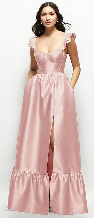 Satin Corset Maxi Dress with Ruffle Straps & Skirt in rose
