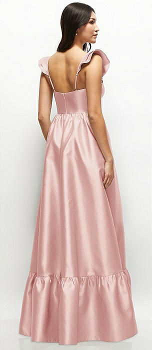 Bow-Shoulder Satin Maxi Dress with Asymmetrical Tiered Skirt in rose