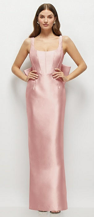 Scoop Neck Corset Satin Maxi Dress with Floor-Length Bow Tails in rose