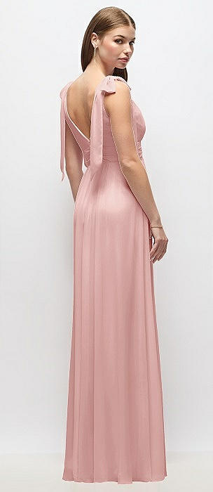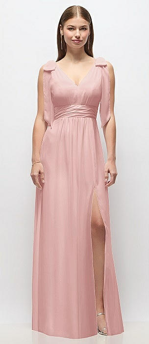 Plunge Neckline Bow Shoulder Empire Waist Chiffon Maxi Dress in rose
