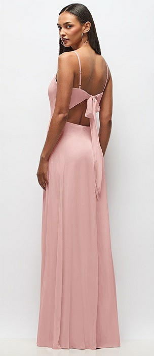 Plunge Neckline Bow Shoulder Empire Waist Chiffon Maxi Dress in rose