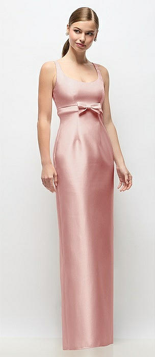 Scoop Neck Satin Column Maxi Dress with Bow at Empire Waist in rose