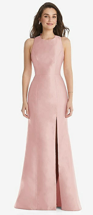 Jewel Neck Bowed Open-Back Trumpet Dress with Front Slit in rose