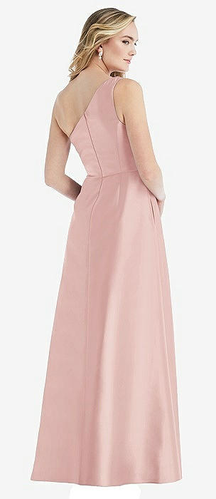 One-Shoulder Satin Gown with Draped Front Slit and Pockets in rose