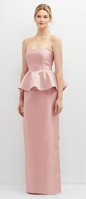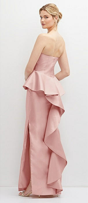 Strapless Satin Maxi Dress with Cascade Ruffle Peplum Detail in rose