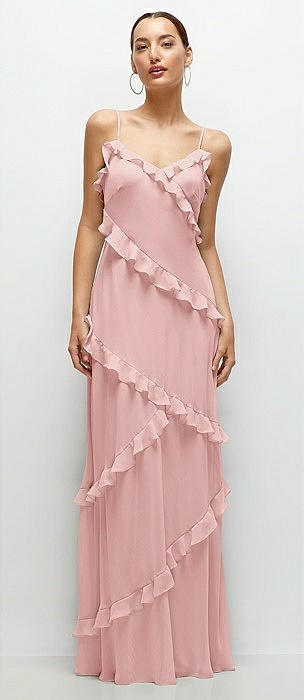 Asymmetrical Ruffle Chiffon Bias Slip Maxi Dress in rose