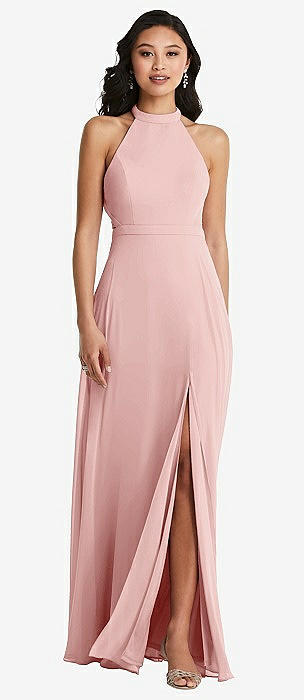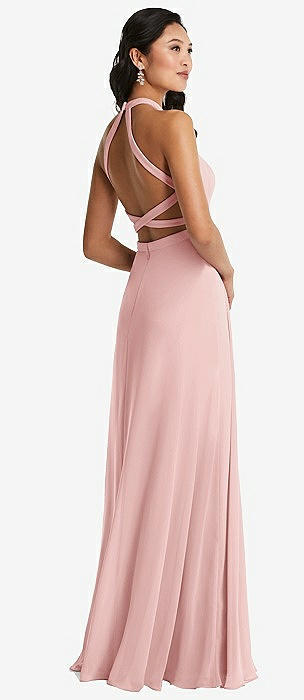 Stand Collar Halter Maxi Dress with Criss Cross Open-Back