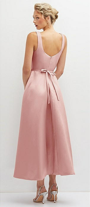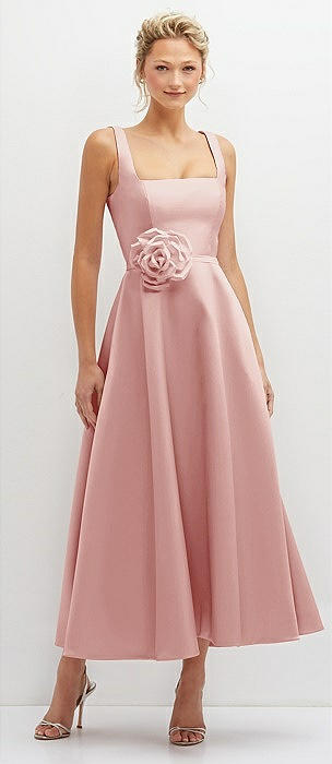 Square Neck Satin Midi Dress with Full Skirt & Flower Sash