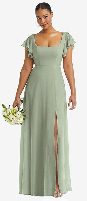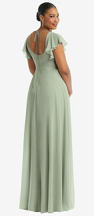 Flutter Sleeve Scoop Open-Back Chiffon Maxi Dress in sage