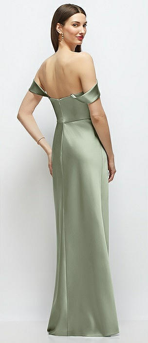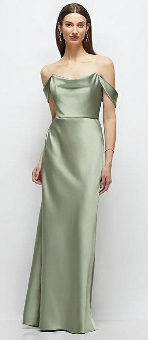 Basque-Neck A-Line Stretch Satin Maxi Dress with Off-the-Shoulder Drape in sage