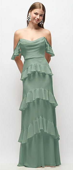 Off-the-Shoulder Cowl Chiffon Tiered Ruffle Maxi Dress with Convertible Ruffle Straps in seagrass