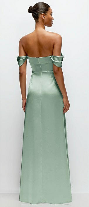 Asymmetrical Off-the-Shoulder Pleated Satin Maxi Dress in seagrass