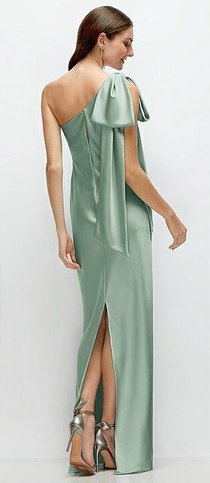 One-Shoulder Bias-Cut Satin Maxi Dress with Cascading Shoulder Bow in seagrass