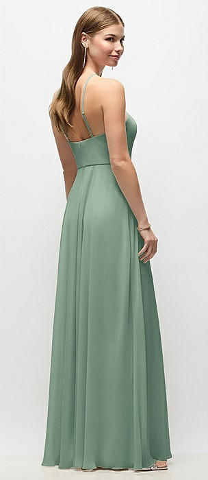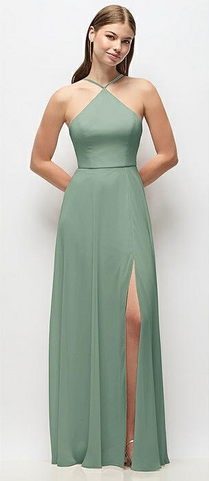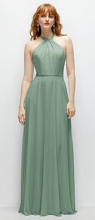 High-Neck Halter Chiffon Maxi Dress with Adjustable Spaghetti Straps in seagrass