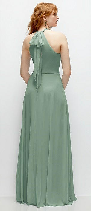 Shirred Halter Chiffon Maxi Dress with Back Sash-Tie Closure in seagrass
