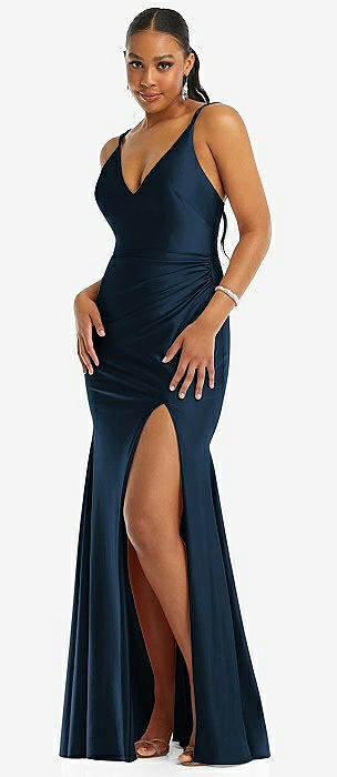 Deep V-Neck Stretch Satin Mermaid Dress with Slight Train in midnight navy