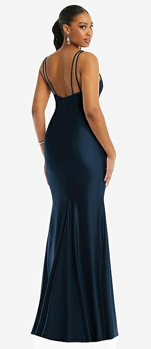 Cowl-Neck Open Tie-Back Stretch Satin Mermaid Dress with Slight Train in midnight navy