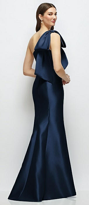 Bow One-Shoulder Satin Maxi Dress with Trumpet Skirt in midnight navy