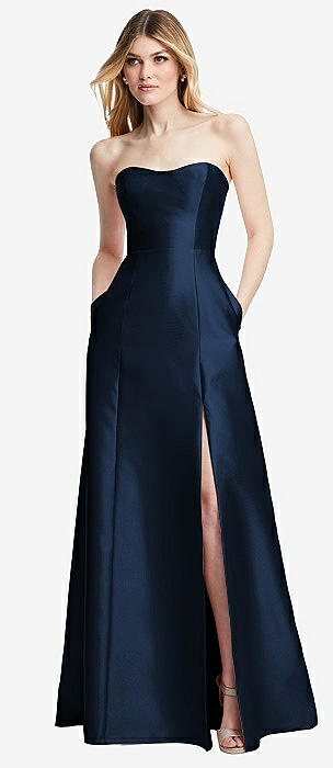 Strapless Bias Cuff Bodice Satin Gown with Pockets in midnight navy