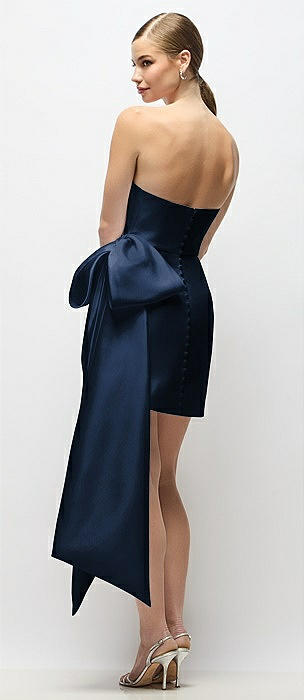 Strapless Pleated Draped Satin Mini Dress with Dramatic Long Tail Bow & Covered Buttons in midnight navy