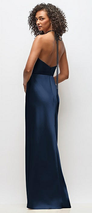 High-Neck Halter Stretch Satin Maxi Dress with Bias A-line Skirt in midnight navy